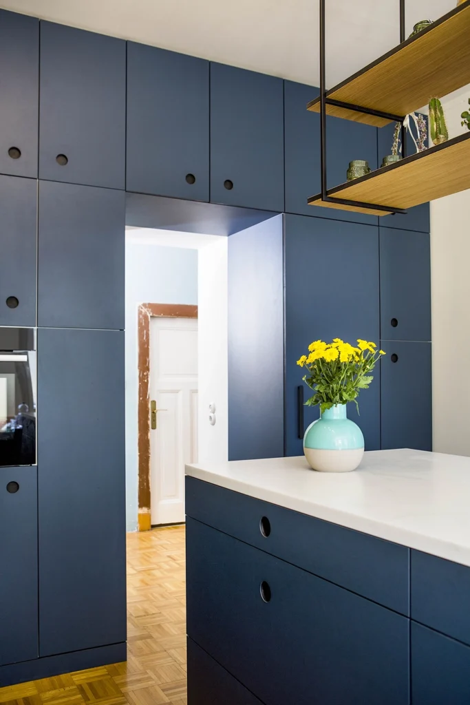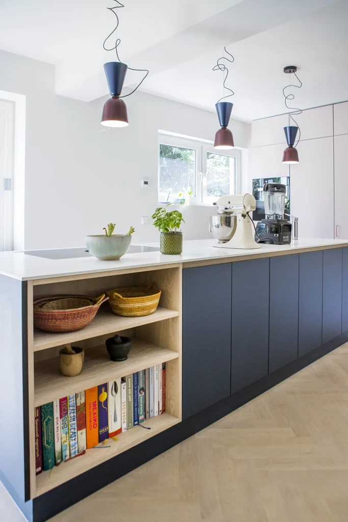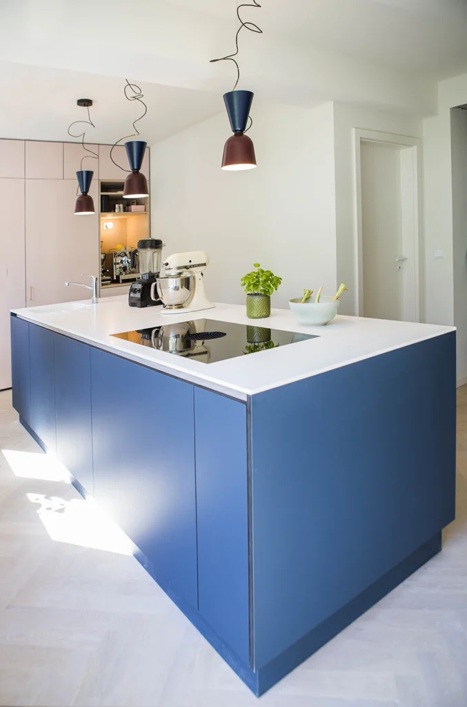 Küchenblock freistehend mit Barhockern Forbo Linoleum in Smokey Blue auf CDF gepresst.